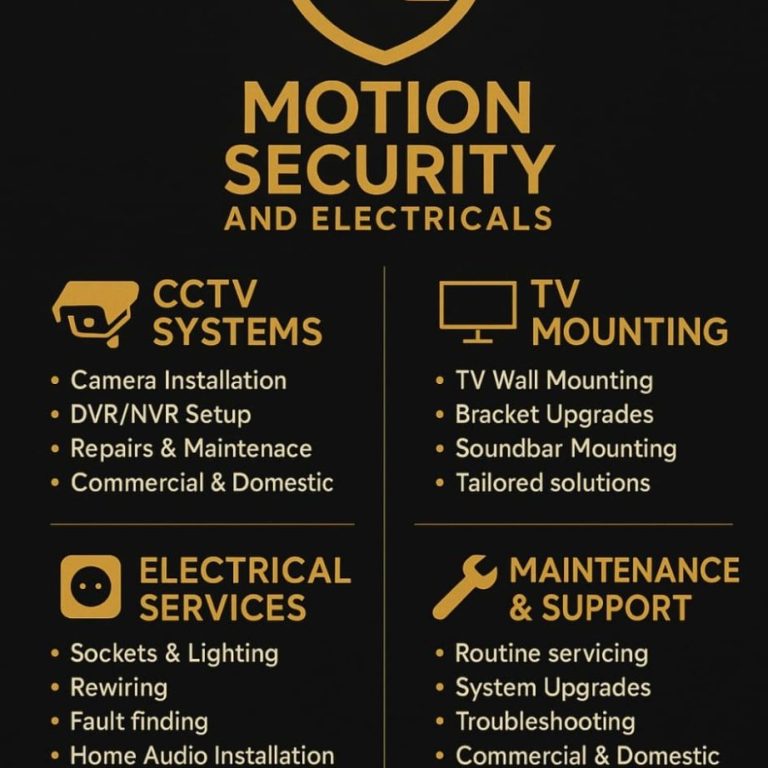 At Motion Security & Electricals, we deliver exceptional security services for residential and commercial properties. Our expertise includes professional CCTV installations that enhance safety and surveillance. We also specialize in reliable TV wall mounting services, ensuring secure and aesthetically pleasing setups for optimal viewing experiences. In addition, our skilled team offers comprehensive electrical works tailored to meet residential needs, prioritizing safety and functionality. Trust Motion Security & Electricals for all your security and electrical requirements. Visit us at mot.